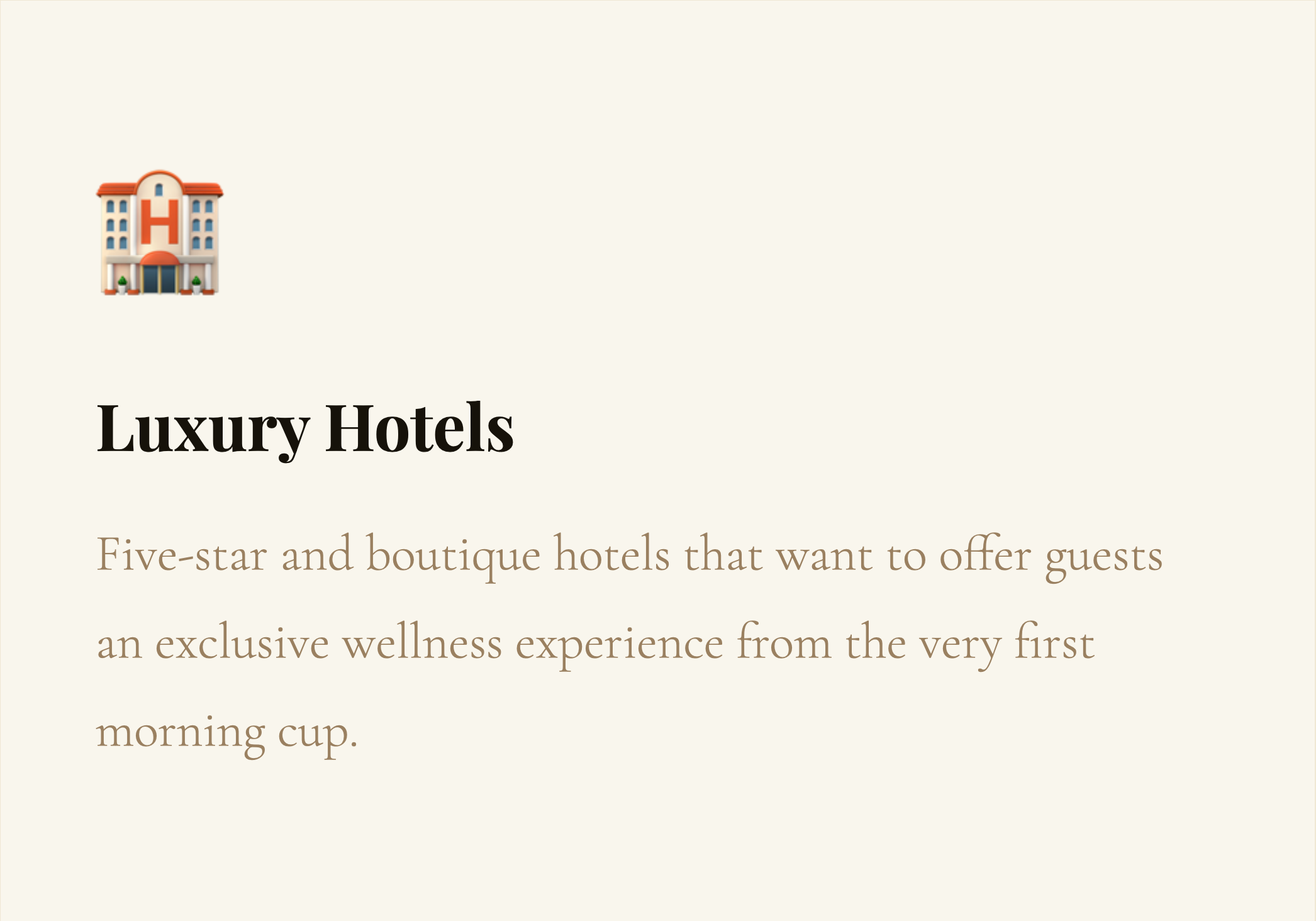 A premium soluble formula ready in 30 seconds. No dedicated equipment. Maximum quality for hotels, spas and gourmet cafés — without compromising operations.